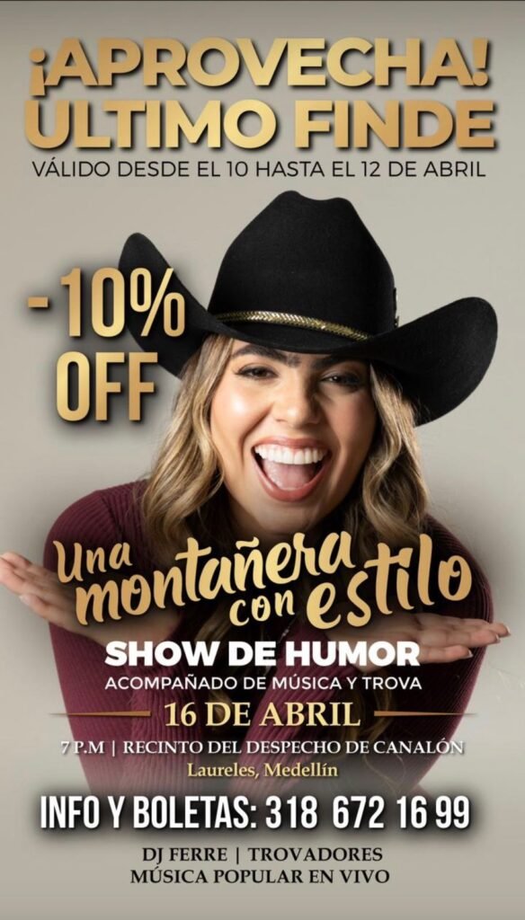 El próximo jueves 16 de abril, en el Recinto del Despecho, en la tradicional zona de La 70 en Medellín, presentará un show en vivo que rompe con el formato clásico del stand-up comedy. La puesta en escena integra elementos de teatro, trova, música y narración, construyendo una experiencia dinámica que combina humor, identidad y emoción.