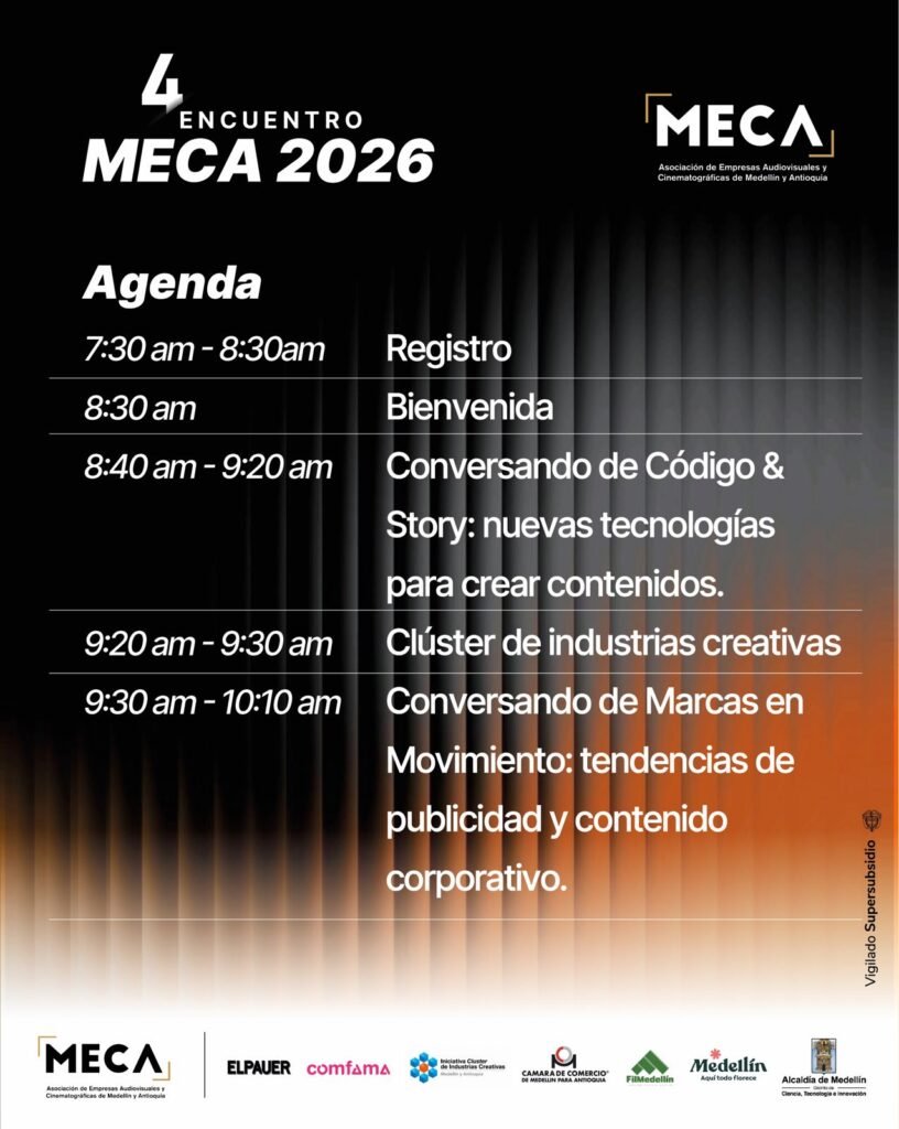 El 4º Encuentro MECA no sólo es una plataforma de negocios, sino también un espacio que impulsa la economía creativa local, fomenta la profesionalización y proyecta a Medellín como un destino de creatividad, producción y contenido audiovisual. Con una agenda que combina ruedas de negocio, charlas inspiracionales y espacios de conexión, el evento se perfila como uno de los hitos más importantes del sector de cara al 2026.
