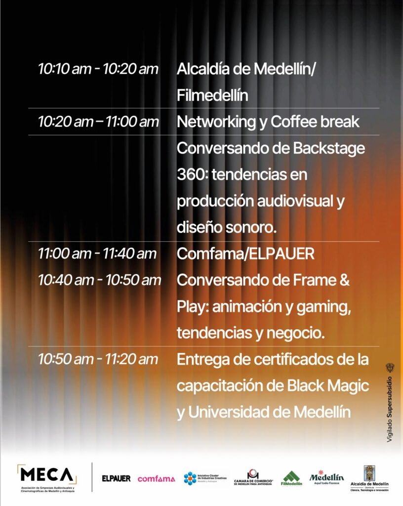 El 4º Encuentro MECA promete ser una jornada intensa y estratégica para el sector audiovisual antioqueño. Entre los principales componentes del evento se destacan: